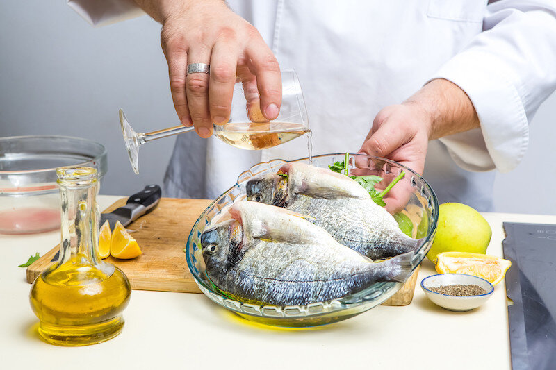 2. Для устранения сильного запаха при жарении рыбы в растительное масло положите одну картофелину, очищенную и нарезанную ломтиками. 3. Рыбный бульон солят в самом начале варки. 4. Соленую рыбу, прежде чем разделывать, заливают холодной водой, чтобы она слегка набухла – тогда ее легче будет чистить. 5. Чтобы рыба не разваливалась при жарке, ее нужно разделать и посолить за 15 минут до приготовления. 6. Сильно соленую рыбу вымачивают в холодной воде в течение 4-6 часов. Через каждые 1-2 часа воду меняют. Хранить вымоченную рыбу не рекомендуется. 7. Внутренности рыбы (не крупной) можно удалить, не разрезая брюшка. Для этого нужно сделать глубокий разрез возле жабр, перерубить позвоночник и удалить голову вместе с внутренностями. 8. При жарке рыбы добавьте в горячее масло немного соли, тогда рыба приобретет хрустящую корочку. 9. Чтобы рыба хорошо отчищалась от чешуи, ее нужно опустить в кипяток, а затем, положить в теплую воду с добавлением уксуса. 10. Кожа с рыбы легко снимается, если пр