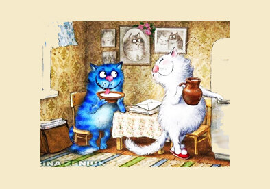Коты, живущие в кузнечном цехе механического завода не понимают домашних котов — что в пылесосе страшного? Забыл вчера кота покормить. Утром просыпаюсь, чем—то гремит на кухне. Наверное, готовит. Бабушка, которая подкармливает собак возле подъезда, гоняет бабушку, которая подкармливает кошек. Парень рассказывает своей девушке: — А у меня кошка необычная. — И чего в ней такого, необычного? — Вот, посмотри фотографии. — Ну… птички… мыши… рыбки… сметана… И что?