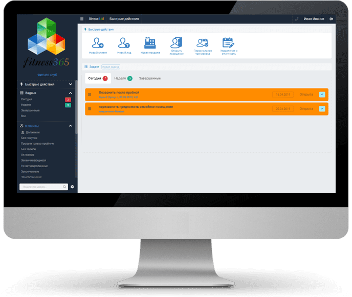 Облачная система Fitness365 — это веб-приложение для управления клубом через браузер из любой точки мира, где есть Интернет. Все сервисы в одном месте: можно эффективно управлять базой клиентов, вести учет посещений, составлять расписание занятий, наполнять базу товаров и услуг, совершать продажи, составлять отчеты и много другое..