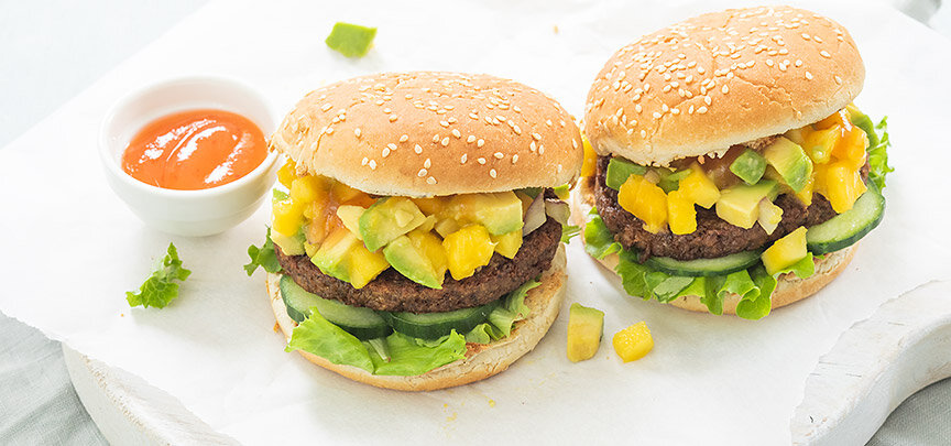 Нарезать манго и авокадо на маленькие кубики и мелко нарезать красный лук, перемешать в миске. Добавьте сок лайма и хорошо перемешайте. Поместите сальсу манго в холодильник как можно дольше. Выпекать гамбургеры на гриле (или на сковороде). Нарезать огурец тонкими ломтиками. Разрежьте бутерброды и слегка обжарьте их внутри. Покройте бутерброды небольшим салатом, ломтиками огурца, вегетарианским гамбургером и выложите на него немного сальсы из манго. Подайте веганские бургеры с соусом чили и, возможно, сальсой из манго, если они остались.