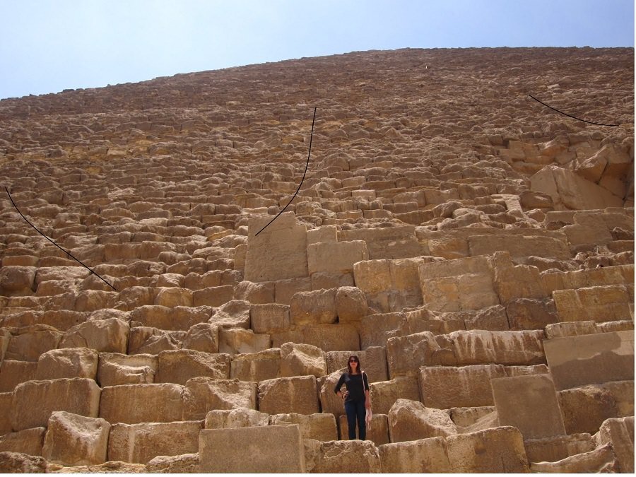 Больше всего паломников Египта и пирамид смущает невероятная кривизна рядов по высоте. Издали ровные, а чем ближе, тем кривей - усадка идет внутрь граней. Если делаешь великое чудо света на века - то или скальное основание ровняй, или фундамент ровный подводи. А что у Хеопса? Про такое говорят: бык насцал. Проследим один ряд.
