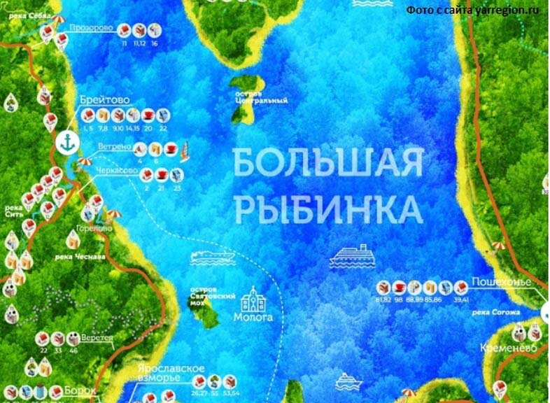 Проект представляет собой карту, на которой отмечены объекты туристической инфраструктуры четырех муниципальных районов Ярославской области, расположенных на Рыбинском водохранилище.