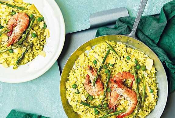 Время приготовления - 40 минут. Ингредиенты (5 порций): * Овощной бульон - 1,25 литров. * Свежий или мороженный горошек - 200 гр. * Спаржа зелёная - 250 гр. * Базелик - 5 веточек. * Сыр пармезан (тёртый)- 50 гр. * Оливковое масло. * Чеснок - 2-3 зубчика. * Лимон - 1 шт. * Масло - 70 но. * Лук-порей (белая часть) - 1 шт. * Длинный рис - 250 гр. * Вино белое сухое - 125 мл. * Креветки (не очищать) - 15 - 25 шт. * Соль. * Черный молотый перец. Этапы приготовления: 1. Довести бульон до кипения и всыпать в него горох и очищенные стебли спаржи. 2. Варить 5 минут, а затем слить бульон. 3. Отделить 3 ст. ложки гороха и убрать их пока. 4. Остуженные горох и спаржу. Положить их в блендер. 5. Положить в блендер: базилик, половину сыра, 3 столовые ложки оливкового масла, 2 зубчичика чеснока. 6. Мелко натереть кожуру лимона. Выдавить 1 столовую ложку его сока. Добавить в блендер. 7. Добавить по вкусу соль, перец и перемешать. 8. Возьмите кастрюлю с толстыми стенками. Разогрейте с добавлен