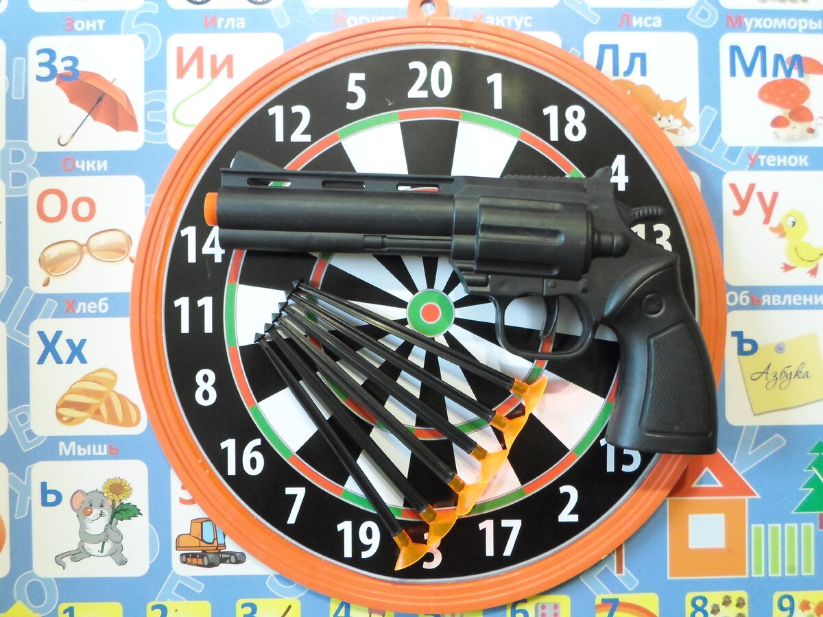 Любителям пострелушек дома - огромный ПРИВЕТ!! Одного пистолета нам с детьми оказалось мало, и вот мы купили ещё один, в этот раз револьвер, стреляющий дротиками с присосками. С цветом определились сразу, даже не поспорив, ведь "оружие" должно быть чёрным. А вот сам комплект визуально не показался надёжным, в блистере всё выглядело хлипковато, вызывало сомненье, будет ли он вообще стрелять. И если будет, то на сколько выстрелов его хватит. Но, как говорится, не попробуешь - не узнаешь! Тем более, цена располагает попробовать.)) Распаковав упаковку, внимательно осмотрел револьвер... Как и ожидалось, дешёвый китайский пластик. Хорошо, что не скрипит и не пахнет. Шесть патронов-дротиков идут в комплекте. Не кривые, без трещин или других повреждений. В руку взрослого влезает нормально, но если Вы почувствуете дискомфорт, то возьмитесь двуручным хватом - сразу представите себя этаким опасным ковбоем в тапочках.)) Процесс зарядки как всегда прост. Пихаем дротик в дуло до ха