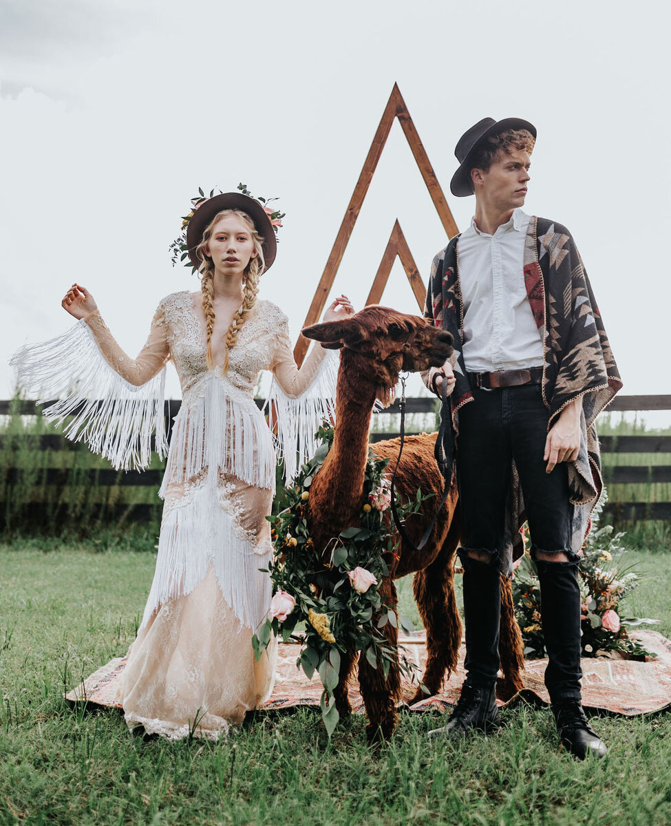 Покажите нам свадебное платье и ламу, и мы будем на десятом небе от счастья! Эта народная свадьба на удивление была современной. Невеста была в кружевном свадебном платье с бахромойи в цветочной шляпе, которая полностью соответствует современным тенденциям. (Кто-нибудь ищет альтернативу традиционной вуале?) Уютное пончо придало жениху непринужденный, но стильный вид. Сочетание этой моды с очаровательной ламой, геометрическим декором, черным сараем и свадебным тортом из макраме, сделало эту свадьбу! Вам нравится эта треугольная коробочка горчичного цвета так же сильно, как и нам?! Смелый черный цвет и поразительные графические детали являются идеальным балансом. Как выйти замуж за деревенского парня и сделать свадьбу стильной? Великолепную сельскую обстановка, простой свадебный наряд, пирамидная арка, винтажный коврик и пышные цветы с ботаническими акцентами и БУМ! У вас потрясающее событие! Серьезно... эти двое могут быть более стильными?! Лама-лама-лама, дай нам драму! Диза