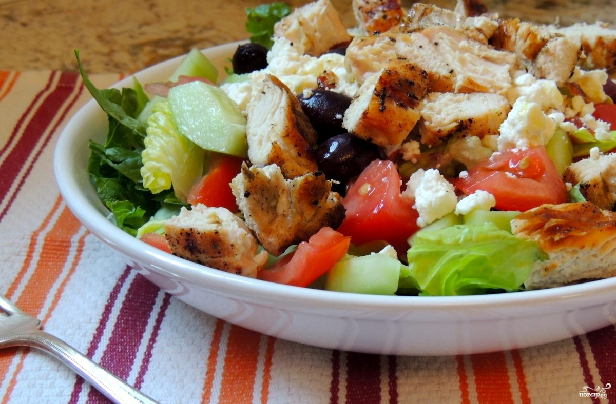 ИНГРЕДИЕНТЫ Соль по вашему вкусу Оливковое масло 5 ложек( столовых ) Белый винный уксус 2 ложки( столовые ) Зеленый салат по вкусу Красный лук 1 штука Маслины 100 г Помидоры 200 г Огурец 1 штука (небольшой) Сыр фета 150 г Куриное филе 350 г ИНСТРУКЦИЯ ПРИГОТОВЛЕНИЯ 1. Готовое куриное мясо нарезать, добавить порезанную кубиками сыр фета, красные помидоры( порезанные на 4 части), черные маслины, нарезанный огурец, тонко нарезанную маленькую красную луковицу и кочан зеленого салата, порванный на кусочки. 2. Взбить масло, винный уксус(белый), столовую ложку свежего и 2 столовые ложки сушеного орегано, приправить по вкусу. Залить заправкой салат и перемешать. Спасибо за просмотр!