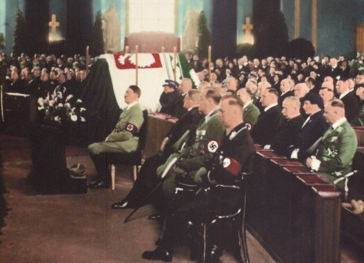 Лично Гитлер написал и жене Пилсудского. По приказу Гитлера в берлинском кафедральном соборе прошла месса по ушедшему диктатору. На фотографии эта месса. Гроб чисто символический. В 1939 г. немцы вошли в Краков, там располагалась могила Пилсудского, сразу был выставлен почетный караул. Геринг тоже скорбил по настоящему человеку, восторгался им.