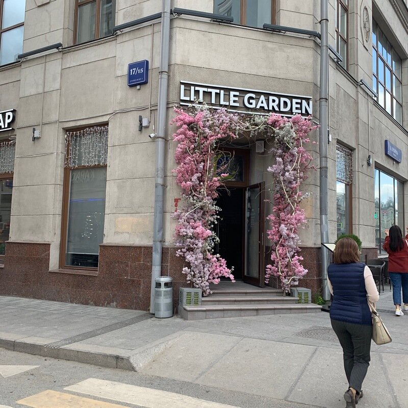 Главная достопримечательность фасадной композиции на первом этаже углового здания на пересечении Большой Лубянки и Большого Кисельного переулка – розово-белая цветочная арка под вывеской Little Garden, обнимающая одиночную дверь.