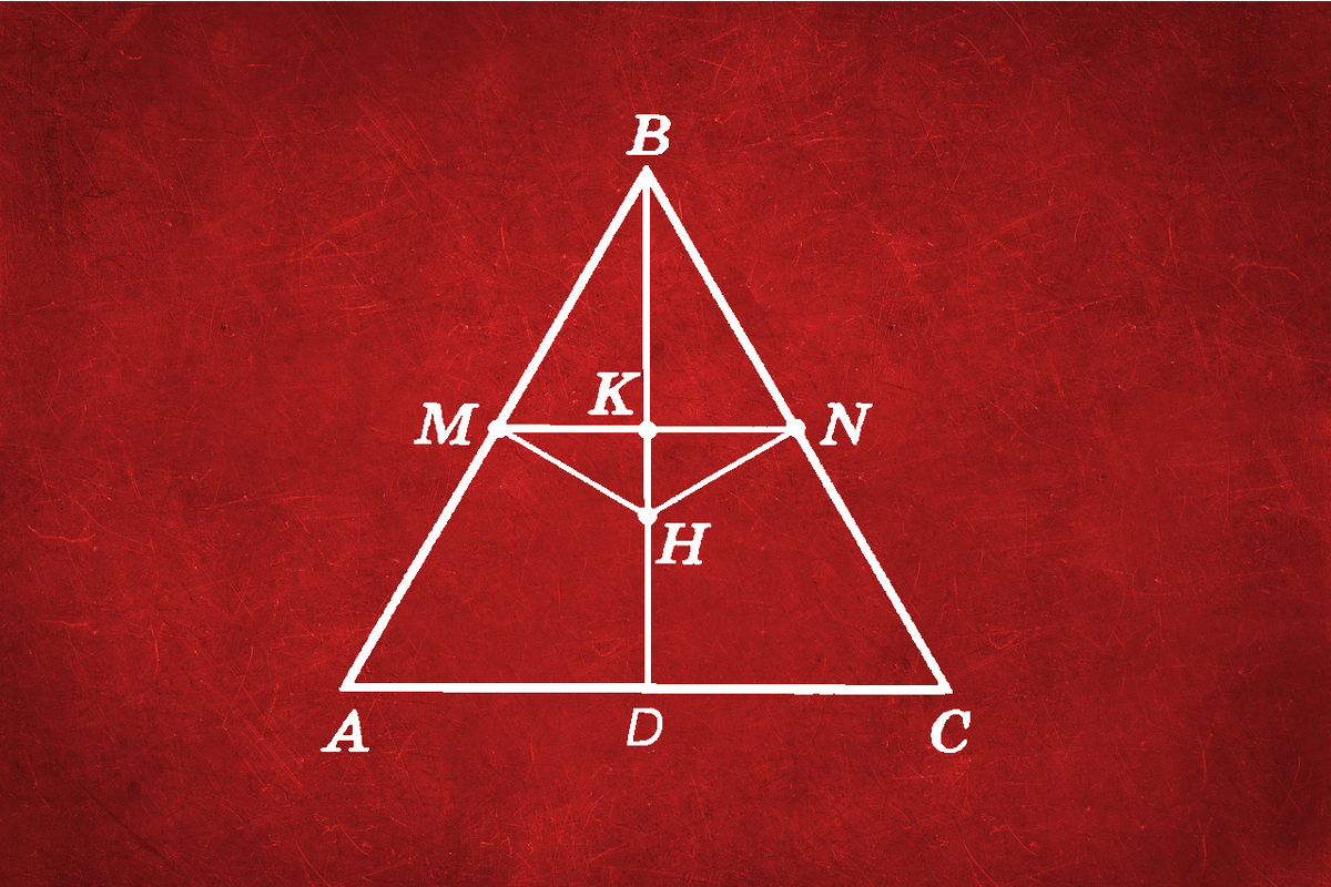 Классическая геометрическая задача на треугольнике. В решении помогут зоркие глаза и базовые знания о треугольниках. Условие: Точка пересечения высот остроугольного треугольника равноудалена от середин его сторон. Докажите, что треугольник равносторонний. Решение: Пусть H - центр пересечения высот (ортоцентр). BD высота треугольника ABC. M и N середины сторон AB и BC. Пусть BD пересекает MN в точке K. Тогда MNǁAC (средняя линия) и BH перпендикулярно AC, значит HK - высота треугольника MHN. Но HM=MN, следовательно HK - биссектриса треугольника MHN. Поэтому ▲HMB=▲HNB и BM=BN, то есть BA=BC. Аналогично BA=AC. Всем кто дочитал, спасибо за внимание! Удачных вам вычислений!