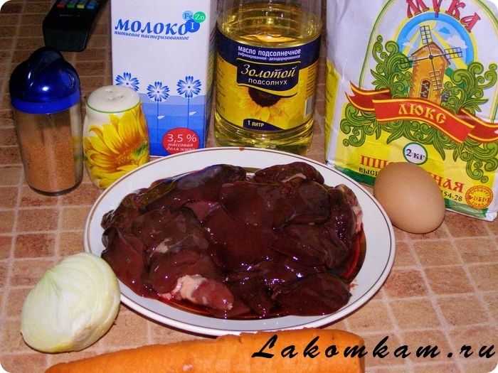 Ингредиенты: печень куриная, можно с сердцами — 500 грамм; молоко или сметана — 1\2 стакана; соль — по вкусу; яйца — 1 штука; лук репчатый — 1 штука; морковь — 1 штука; масло растительное в тесто — 2 столовые ложки и для жарки; мука пшеничная — 2-3 столовые ложки; перец и приправы по вкусу.