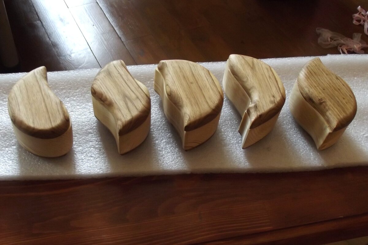Приветствую! Несколько лет назад перед 8 марта нужно было придумать что подарить жене, дочке, маме, а также теще и невестке. :) На долгие раздумья времени не было, по этому решил сделать небольшие шкатулки для разных мелочей. Чтобы как-то отличать кому что дарить, форму этих шкатулок решил делать разную. По размеру они сделаны примерно с открытую ладонь. Материалом для корпуса послужила пихта, а для дна и крышек маньчжурский орех. Форму я постарался сделать разную и где-то узнаваемую: рыбка, котик, волна, запятая или капля и ещё разновидность волны Несмотря на то, что приготовлены изготовлены они были на скорую руку, всем женщинам понравилось и действительно и по сей день они используются для разной мелочевки. Спасибо, что дочитали. Ставьте лайки, подписывайтесь на канал. Будет ещё много интересных деревянных штучек. С уважением, Александр. P.S. Вам может быть интересно: Очаровательные питомцы из дерева Подвеска- сердечко из дерева с неоднозначным рисунком. Чемоданчик на все случаи жи