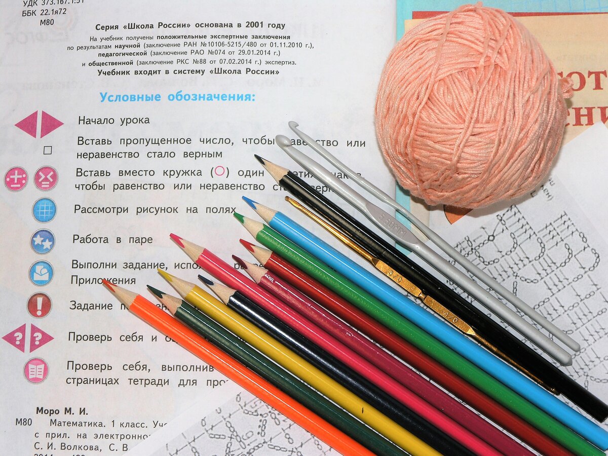 Сегодня первый учебный день у моей первоклашки. Отвела в школу, забрала… Можно, и повязать. Дочка самостоятельная, аккуратно повесила форму, перекусила, побежала выполнять домашнее задание. Красота)))) По-моему, так и должно быть. Через некоторое время прибегает: учительница велела делать задание вместе с родителями. С родителями в первый учебный день? Старшая дочка пошла в шестой класс. Даже я, родитель со стажем, такого не ожидала. Вязание отложила… Задание творческое: нужно придумать условное обозначение для учебника математики. Первое, что пришло в голову... значки столбиков с накидом и без накида. А что? Схема вязания сродни математической формуле. Логика на лицо. Попробуй пропусти столбик, и схема распадется. «Математика вязания» - это название для статьи придумала давно, пока не написала… Всё-таки семилетки – ответственный народ. Но что бы ни сказали им, понимают буквально и в то же время избирательно. Эта возрастная психологическая особенность совсем не учитывается школой.