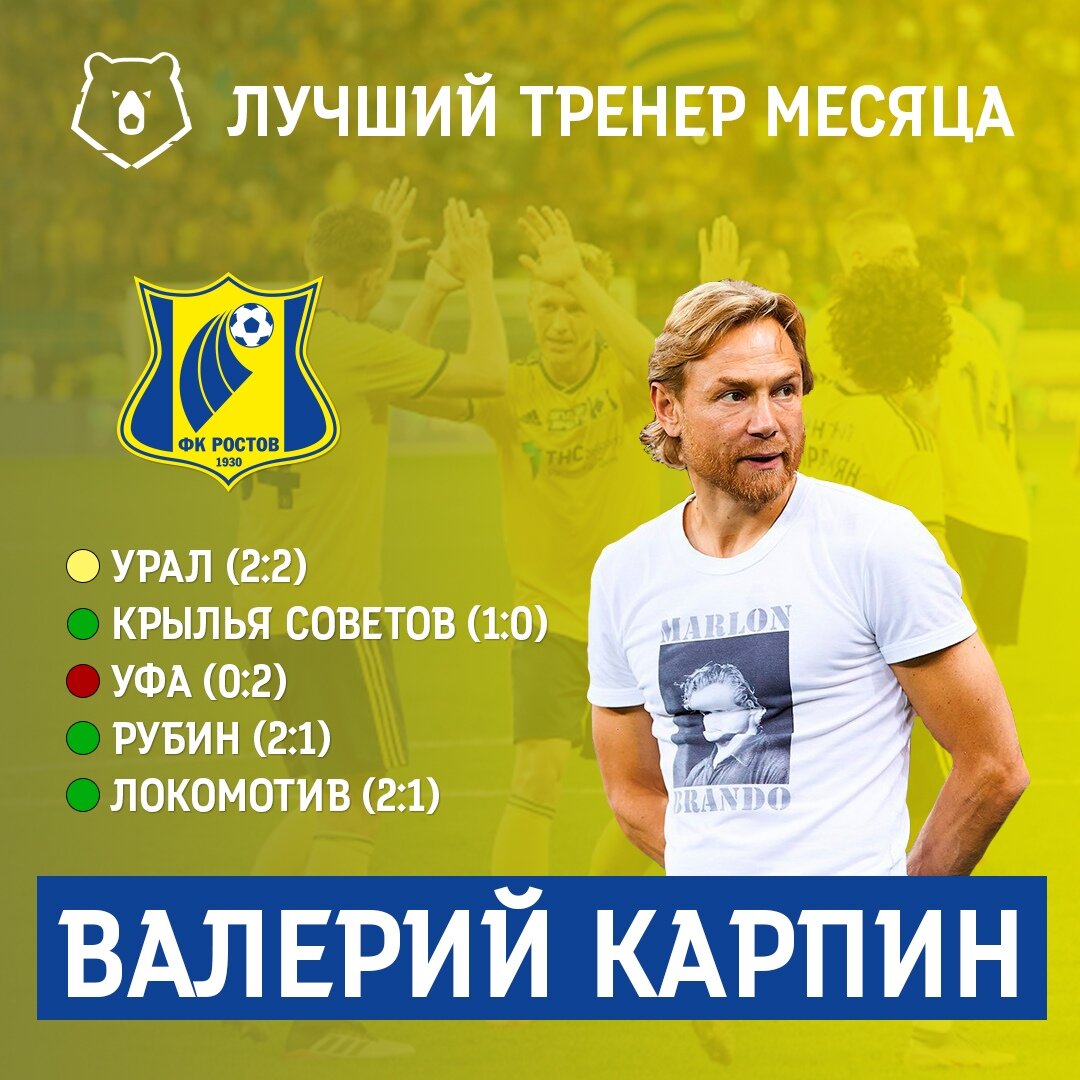 Главный тренер «Ростова» Валерий Карпин второй месяц подряд признан лучшим тренером российской Премьер-лиги. Эксперты РПЛ отдали свои голоса за тренера «Краснодара» Сергея Матвеева, болельщики и эксперты «Матч Премьер» проголосовали за Валерия Карпина! После восьми туров желто-синие занимают третью строчку в таблице, имея равное количество очков с «Краснодаром» и «Зенитом». Поздравляем Валерия Георгиевича с заслуженной победой.