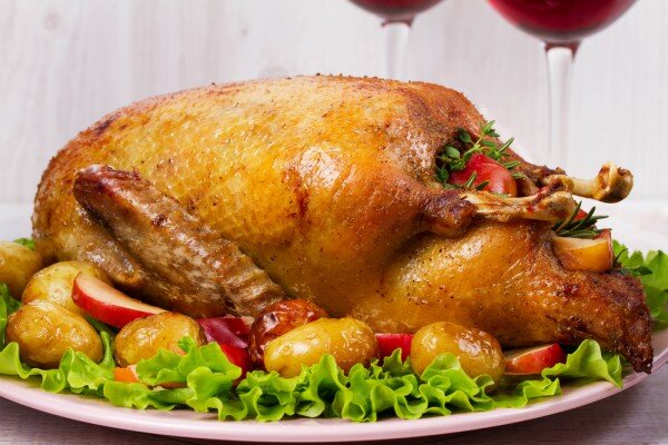 ЗАПЕЧЕННАЯ УТКА ингредиенты на 3 порции Способ приготовления: Разогреть духовку до 220 °C. Выложить уток грудкой вниз на рабочую поверхность и в местах с жиром вдоль спины и бедер сделать надрезы с обеих сторон. Перевернуть и также сделать надрезы в местах с жиром в области груди. Вокруг особенно жирных областей сделать несколько отверстий. Начинить утку луком и 4 веточками розмарина. Щедро приправить солью и перцем. Поместить уток грудками вниз в большую жаропрочную сковороду, влить 1/2 стакана воды. Запекать, поворачивая иногда сковороду, пока утиный жир не начнет топиться, вода не испарится, и кожа не приобретет золотисто-коричневый цвет, около 40 минут. Достать сковороду из духовки и переложить уток на тарелку. Осторожно вылить растопленный жир в мерную, жаропрочную чашку. Перемешать картофель и 1/4 чашки утиного жира в сковороде (сохранить оставшийся жир для другого использования). Приправить солью и перцем. Разложить картофель по периметру, в центр выложить уток грудками в