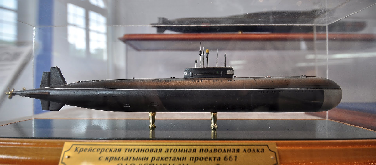 Но самое главное, лодка должна была обладать сверхвысокой скоростью, не менее 38 узлов, чтобы догнать авианосное соединение, нанести удар и быстро скрыться. Для достижения такой скорости, корпус лодки изготавливался из титана. Водоизмещение в подводном положении составляло 7 000 тонн. Длина 107 метров. Экипаж 82 человека. Мощность силовой установки 177 мегаватт. Это были два атомных реактора водо-водяного типа ВМ-5м.