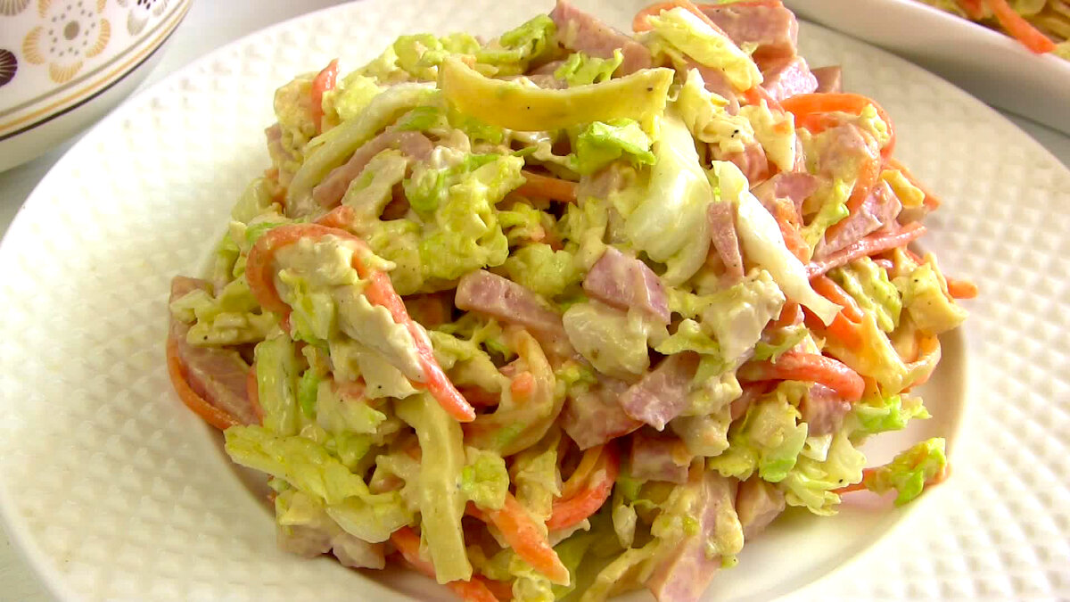 Очень-очень вкусный салат! Гости все довольны и получается его очень много и готовится он очень быстро . Продукты Капуста пекинская 1 кочан средний Ветчина 300 г Грудка куриная отварная 300 г Морковь по-корейски 200 г Майонез 150-200 г Соль,перец повкусу Блинчики Яйца 4 шт. Мука 1 ст.л. Крахмал картофельный 1 ст.л. Соль 1 щепотка Начнем с приготовления яичных блинчиков. В миску кладем 4 яйца, столовую ложку крахмала картофельного, столовую ложку без горки муки, щепотку соли и все вилкой взболтать до однородной массы. Смазываем сковородку растительным маслом и выливаем примерно одну четвертую часть теста. Жарим с двух сторон. Блинчики очень быстро готовятся и получается 4 блинчика.Диаметр сковороды 20-22 сантиметра.Выкладываем на тарелку и пускай пока остывают. Пекинскую капусту ,средний кочан,нарезаем соломкой, только нежную часть. Ветчину 300 граммов нарезаем соломкой. Куриную грудку нарезаем на кусочки. Блинчики по 2 складываем и сворачиваем в рулет .Нарезаем соломкой. Отправляем