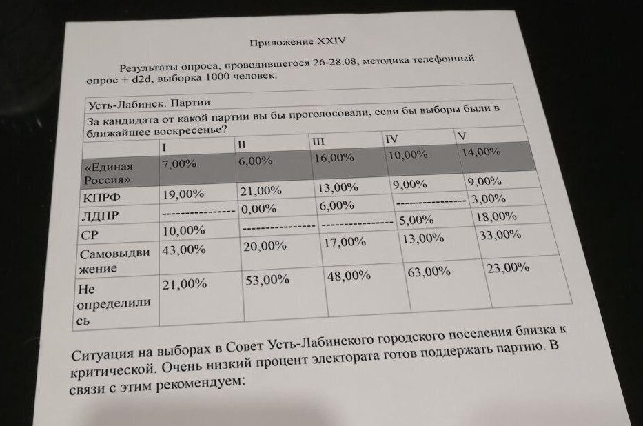 В документе приводилась аналитика по всем районам Краснодарского края. Изучали регионы, где «Единая Россия» почти наверняка выиграет выборы, и те, где вероятность проигрыша велика. Усть-Лабинск оказался лидером «красной зоны» - жители нашего города при исследовании демонстрировали стойкую антипатию к кандидатам от партии власти. Лишь в одном округе высокая вероятность