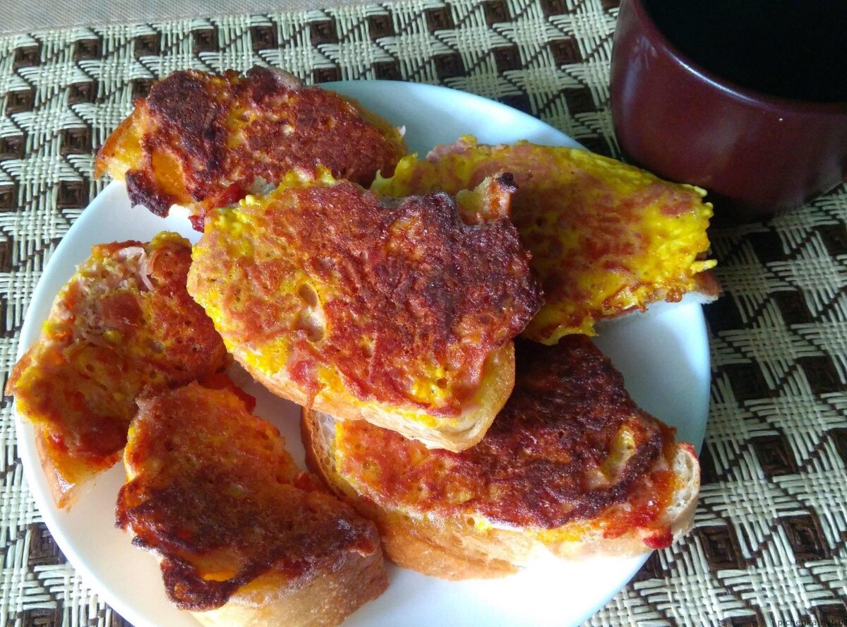 Эти гренки замечательный вариант для быстрого и вкусного завтрака. И для приготовления чудо-завтрака понадобится всего 4 ингредиента: колбаса вареная, яйцо, батон и кетчуп или томатный соус. Батон нарезать ломтиками, можно использовать уже черствой батон, намазываем ломтики кетчупом.