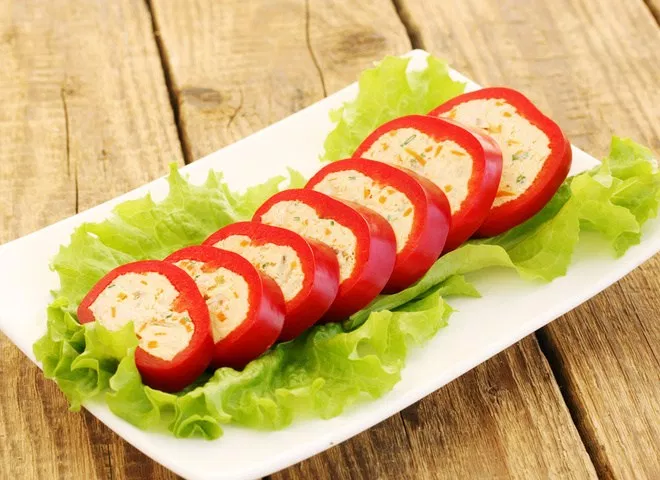 Летом в продаже появляется свежий перец. Не упустите возможность приготовить с ним интересные блюда. Я нашла рецепт закуски с болгарским перцем. В корзиночки из перчиков выкладывается творожная начинка, получается вкусная и необычная закуска. Подготавливаем болгарский перец Помойте перчики, срежьте верхушки с хвостиками. У вас получатся емкости, в которые вы будете выкладывать начинку. Почистите ножом содержимое, промойте еще раз перцы внутри, чтоб не оставалось косточек. Немного посолите их внутри и оставьте настаиваться, это поможет убрать горечь. Начинка из творога Возьмите жирный творог. С ним начинка получится нежнее. Протрите его через сито. Далее натрите мелко плавленые сырки и добавьте немного чеснока. Его можно тоже потереть на мелкой терке или воспользоваться чеснокодавилкой. Перемешайте все ингредиенты, добавьте немного сливочного масла, перца и соли. Не переборщите с солью. Помните, что вы уже посолили перец. Фаршировка перцев Достаньте перцы из холодильника и начните нап