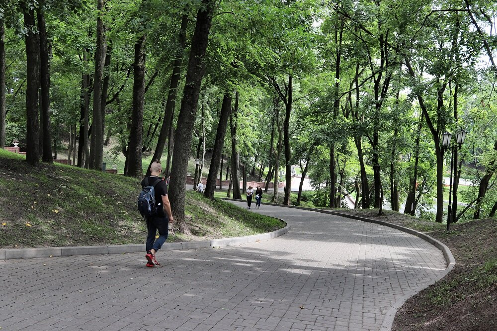 Про городской парк города Гомеля читал в интернете, в живую все оказалось намного интереснее. Парк расположен на берегу реки Сож. Местность здесь неровная, гористая, что было использовано создателями парка на полную катушку - пешеходные мостики, лестницы, живописные дорожки. Есть что посмотреть. В советское время парк держал твердое второе место среди парковых ансамблей всего Советского Союза - это что-нибудь, да значит. Изюминка парка - живые белки. К встрече с ними мы не подготовились, и как оказалось зря. Белки совершенно ручные, людей не боятся. Смело бегут на встречу, просят что-нибудь поесть. К сожалению, в этот момент у меня в руках был только фотоаппарат. В Петрозаводске в парке "Беличий остров" тоже есть белки, но они более дикие, настороженные, к незнакомому человеку просто так не подбегут. В парке Гомеля белки не стесняясь туристов устраивают на деревьях целые шоу. Весело играют не обращая никакого внимания на наведенные на них фотоаппараты и смарфоны. По всему парку на