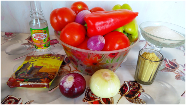 Для его приготовления нам надо взять 1 кг лука, , 1 кг болгарского перца и 1 кг спелых помидоров. Это основные компоненты. Теперь то, что можно менять по своему вкусу: 1 чайная ложка сухой горчицы (я беру больше: 2-3 особого вкуса она не дает, но является прекрасным загустителем. Салат получается не жидкий). 1 чайная ложка красного молотого перца (здесь я беру значительно меньше – на свой вкус). 1 стакан сахара (считаю что это точно перебор. Слишком сладко. Поэтому кладу 2-3 столовых ложки) 1 десертная ложка уксуса 70%.