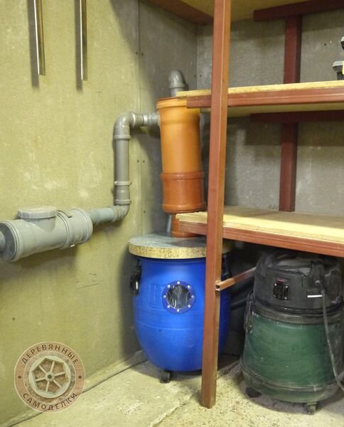В этом варианте уже плющить входную трубу не надо. В качестве емкости используется пластиковая бочка. Проверив работоспособность циклона я решил сделать стационарную разводку по мастерской, так как трехметрового шланга безусловно мало, а пылесос с циклоном достаточно громоздки и неповоротливы. Благодаря тому, что использовались канализационные трубы, собрать такую разводку - дело одно часа. Пылесос и циклон задвинул в самый дальний угол, а по мастерской развел 50 мм трубы.