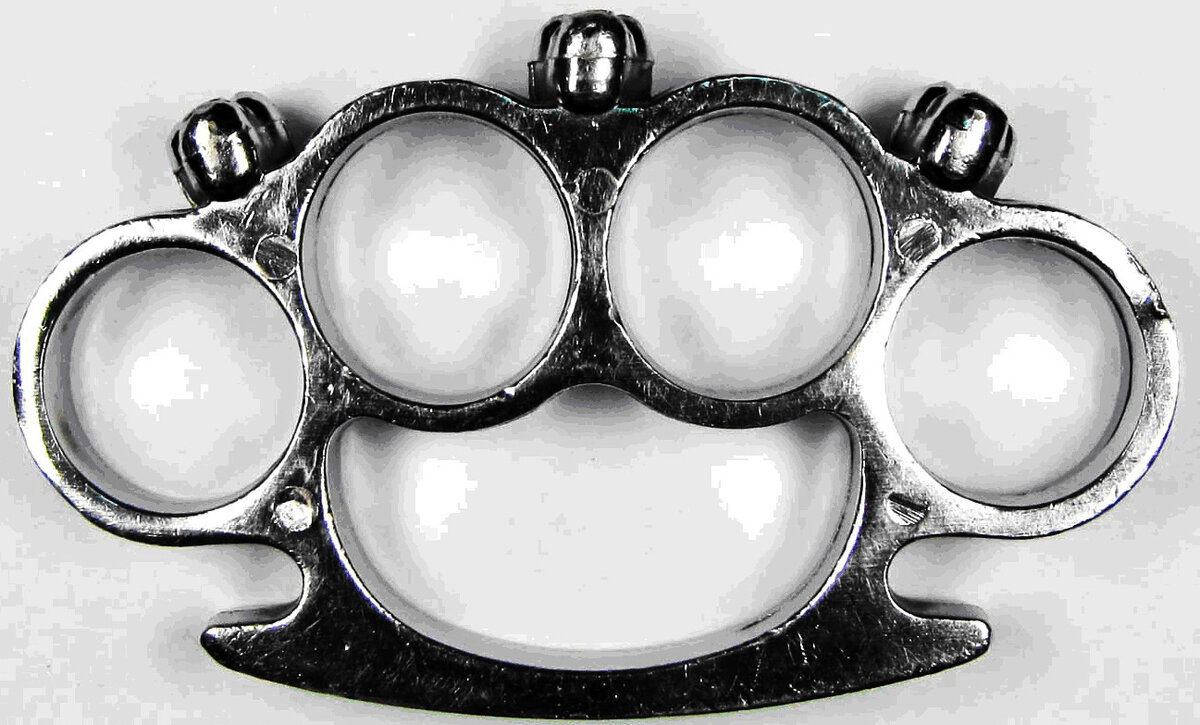 Всем привет! Не так давно мы изучали самодельный кастет (статья о нём тут) - низкое качество и отсутствие эстетического вида, конечно же, не главное в ударно-раздробляющем оружии и на поражающую силу не влияют. Однако если уж красоваться перед кем-нибудь то, наверное, наш свежий образец подойдёт для этой цели больше. Кустарное изготовление почти заводского качества, «художественное» оформление и классическая форма, давайте смотреть. Кастет литой, выполнен из металла светло-жёлтого цвета с наружным покрытием под хром, представляет собой металлическую пластину массой 143 гр., максимальной шириной 65 мм, максимальной длинной 107 мм, толщиной 10,5 мм. Состоит из остова отверстиями для пальцев и ударной частью, и упора со стойками. Упор дугообразной формы длиной 73 мм, толщиной 10,5 мм. Ударная часть кастета извилистой дугообразной формы, расположена над отверстиями для пальцев. На ударной части имеется три дополнительных поражающих элемента в виде человеческих черепов размерами 11,4х15х