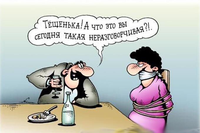 Один мужик решил подшутить над своей тещей, которая его запилила почти насмерть. Воспользовавшись тем, что дорогая мама учапала на рынок, зятек выпилил дырку в обеденном столе, потом залез под него, просунул голову в отверстие и замер в таком положении. Скатерть свисала до полу, и тела шутника не было видно. Еще он предварительно обильно полил кетчупом все вокруг своей дурьей башки. А теперь представьте, что увидела вздорная баба, вернувшись домой? На скатерти лужа крови, а в центре стола возлежит отрезанная голова зятя с высунутым языком и скошенными глазами. Тещенька завизжала с такой силой, что с потолка свалилась криво висящая люстра и долбанула любителя розыгрышей прямо по кумполу. Зять, правда, не окочурился, но оглушительно заорал. Теща, услыхав, как отрубленная голова отчаянно матерится, окончательно потеряла рассудок и метнула в парня только что купленную литровую банку с томат-пастой. Естественно, банка попала шутнику прямо в лоб. Очевидно, кости у мужика были толщиной с бето