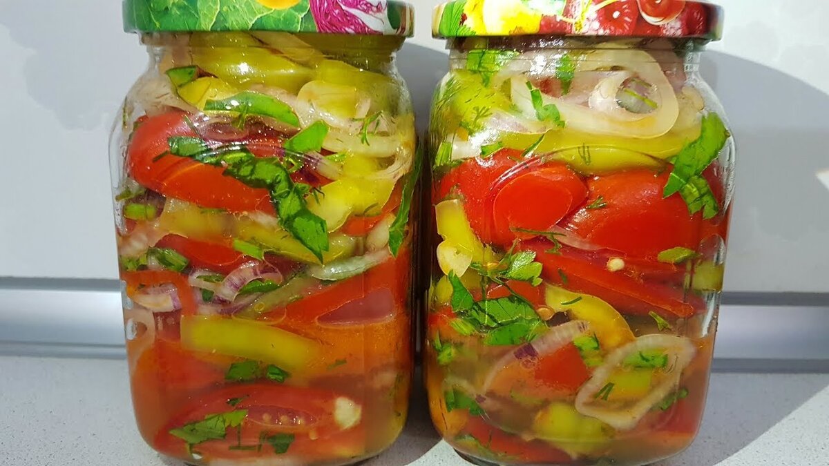 Салат готовится просто, а получается очень вкусно. Ингредиенты: 1. Помидоры - 1 кг. 2. Сладкий болгарский перец - 250 гр. 3. Репчатый лук - 250 гр. 4. Свежая зелень. 5. Чеснок - 5 зубчиков. 6. Лавровый лист - по 1 шт. в каждую банку. 7. Черный молотый перец - по 5 шт. в каждую банку. 8. Растительное масло - 50 мл. 9. Сахар - 1/2 ч. ложки в каждую банку объемом 700 мл.. 10. Соль - 1 ч. ложка в овощи. 11. Уксус 9% - 1 ч. ложка в каждую банку объемом 700 мл. Способ приготовления: 1. Помидоры разрезать на 4 части. Лучше всего использовать сливовидные помидоры. Болгарский перец нарезать полукольцами. Лук нарезать кольцами. Мелко нарезать свежую зелень (зелень можно взять любую). Зубчики чеснока нарезать тонкими пластинами. 2. В глубокой миске соединить помидоры, сладкий перец, лук и чеснок. Влить растительное масло (50 мл) и добавить соль (1 ч. ложка). Хорошенько все перемешать. Добавить зелень и ещё раз перемешать. Оставить на 30 минут, чтобы салат равномерно просолился и дал с