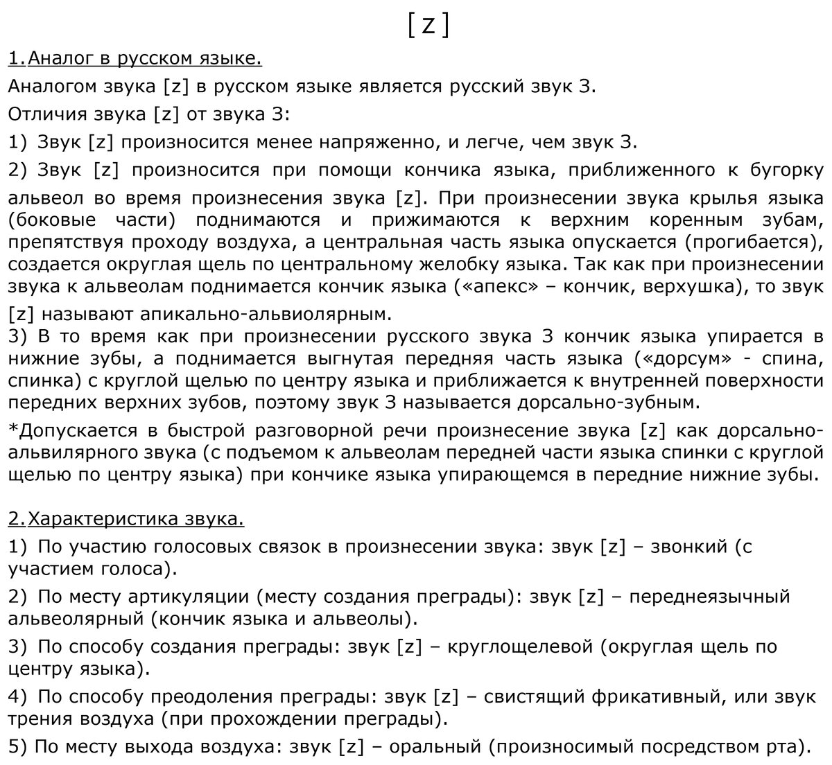 кончик языка приближается к альвеолам, и получаются не смягчающиеся твердые звуки [z] & [s], возможно и дорсальное произнесение звуков - как З и С, но никакого подъема средней части языка, чтобы не получить З' и С' Звук [ z ] Звук [ s ] Небольшое обобщение Итак, звуки [ z ] & [ s ] относятся к группе щелевых шумных ротовых звуков (воздух с шумом трения проходит сквозь круглую щель в передней части рта, образуемую альвеолами и кончиком языка). Забегая вперед, отметим, что к этой же группе " щелевых шумных" звуков относятся еще два парных и один непарный согласные звуки: Все указанные звуки, как и [ z ] & [ s ], а также ранее рассмотренные нами звуки [v] & [f], [ ð ] & [ Ɵ ], образуются с помощью создания щели, сквозь которую проходит воздух с шумом трения (при этом в создании звонких звуков также участвует голос). Этим они и схожи. Поэтому, мы и рассмотрим их впоследствии в первую очередь. Полезные ссылки Послушать и воочию увидеть произношение звуков [ z ] & [ s ] в