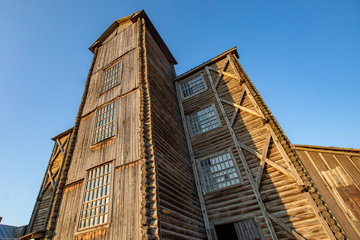Это уникальный объект деревянного зодчества — четырёхэтажная мельница, построенная в 1927-1929 гг БЕЗ ЕДИНОГО ГВОЗДЯ, все элементы крепежа выполнены из дерева. Западная Сибирь. Алтайский край. Берег Оби. Село Усть-Чарышская пристань. 150 км к югу от Барнаула. В село мы попали по основной его, исторически сложившейся, транспортной артерии — по Оби. Ещё издали, с реки, моё внимание привлекло необычное сооружение, сложенное из бревен, 4 этажа! Со стороны села мельница тоже выглядит великолепно. Она завершает одну из главных улиц села и кажется главным акцентом окружающего пространства. В основании мельницы прямоугольный план, её высота 17 метров. С юго-западной стороны — прируб, в нем располагается двухмаршевая лестница . В голове не укладывается как такую красоту могли построить тогда безграмотные крестьяне, и как она простояла 90 лет!!! Руководил строительством прораб Зверев. Мельница до сих пор в рабочем состоянии, хотя и законсервирована. Странно, что мельницу нам показали