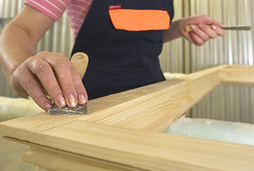 Покраска любого окна начинается с подготовительных работ. Для нового окна подготовка проходит в три этапа: шлифовка, пропитка и грунтовка. Для удобства работы рамы лучше снять с навесов и расположить в горизонтальном положении на высоте около одного метра. При помощи мелкой шлифовальной шкурки с дерева нужно снять все шероховатости и заусеницы до идеально гладкого состояния. Для проверки качества шлифовки, можно провести по дереву ладонью, и если под рукой будут ощутимы неровности, работу следует продолжить до получения желаемого результата.