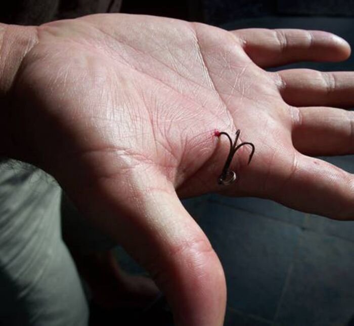 Ловля рыбы — занятие, довольно приятное, особенно если есть что ловить. Но случается, что улов может превзойти все ожидания. Звучит забавно, но ситуация крайне неприятная. Что делать если словил самого себя? Как достать крючок из пальца, первоначальные действия Главное — без паники. Идеально конечно отправится в медпункт. Если до ближайшего два локтя по карте, то извлекать крючок придется самому. Хорошо, если с вами будет товарищ, чтобы подсобить. Освободите крючок от наживки и лески в первую очередь. Далее осмотрите живца т. е. место прокола. Мелкий крючок с маленькой зазубриной Попавшись на мелкий крючок с небольшой зазубриной, проблем с вытаскиванием быть не должно. Немного прокрутите и расшатайте крючок в пальце, и он поддастся. Можно аккуратно дернуть и крючок также выйдет без особого вреда. Обязательно нужно обработать рану, чтобы избежать неприятных последствий. Подойдет любой антисептик, водка, в том числе. Залепите пластырем. Это не страшно, можно продолжать рыбачить. Если