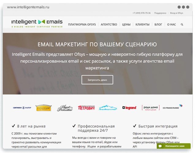 2. Ofsys (Intelligent Emails) – предлагает глубокие настройки API-интеграции с использованием данных о пользователях. Техподдержка меняет функционал под задачи клиента. Стоимость пользования в месяц дороже Mailchimp, к тому же нужно отдельно платить за подключение аккаунта. Чтобы запустить рассылку по готовому шаблону потребуется 10-20 дней. Из ограничений – нельзя создавать письма, основанные на действиях пользователей или с динамическим содержанием, без участия техподдержки.