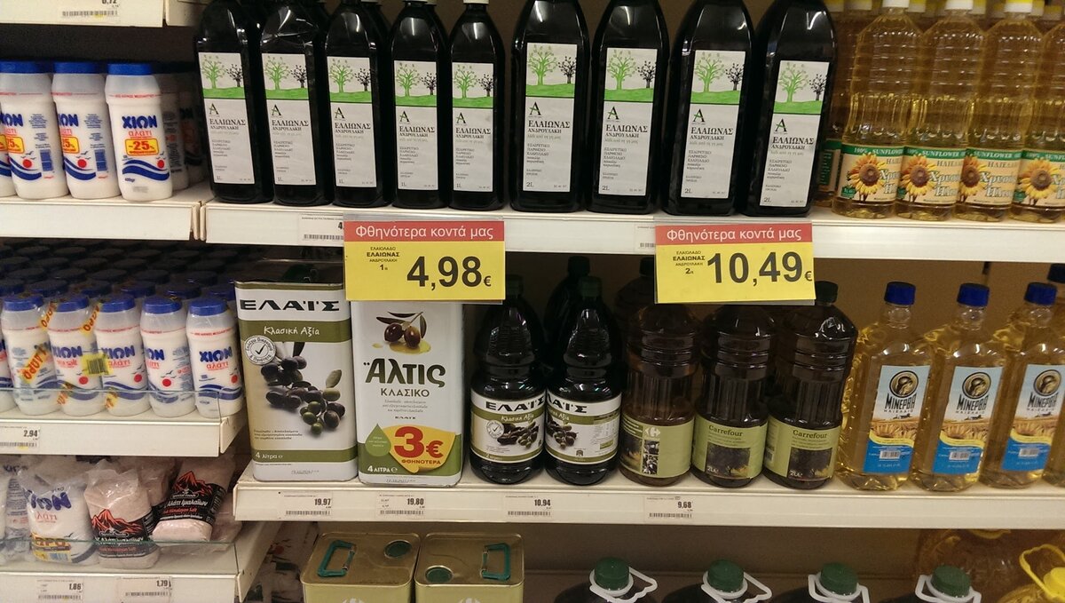 Года два назад в этой сети появилось масло собственной марки. Фото у меня нет, к сожалению. Круглые зеленые пластиковые бутылки с зеленой этикеткой с растительным орнаментом и надписью Халкиадакис. Стоит это масло около 6 евро. Берите его совершенно смело. Оно не для туристов производится, а скорее для местных жителей. И обычно даже стоит на отдельной малозаметной стойке. Масло отличное. А подсказали мне его покупать местные жители. Пластик меня совершенно не смущает, если что.