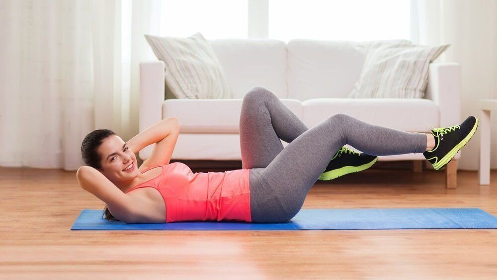- С руками за головой совершаем “скручивания”, стараясь, чтобы нагрузка шла не на поясницу, а на сам пресс.