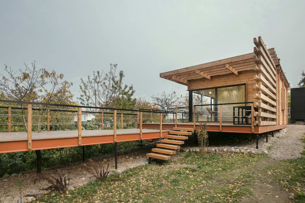 Сын-архитектор за два лета спроектировал и построил для матери дачный домик — такой, о котором она давно мечтала. При строительстве не обошлось без компромиссов, но в целом — результат заслуживает внимания. Информация от архитектора. Изначально я планировал делать модульный дом на основе «каркасника», так как это одно из направлений моей архитектурной студии. Но понял, что придется вложить еще прилично средств и времени во внутреннюю отделку, а этого хотелось избежать. Тогда приняли решение строить «сруб». Правда, очень специфический: из клееного бруса толщиной 7 см. С конструктивом мне помогал архитектор Иван Амосов, специализирующийся на брусовых домах, совместно с нашим прорабом Николаем Короленко. Большинство перерубов — скрытого типа, поэтому и внутри и снаружи дом выглядит, как каркасник. Чего я и добивался. Ну, и, разумеется, в таком доме не требуется внутренняя отделка: мы просто покрасили его изнутри и пропитали специальными пропитками снаружи. Учитывая рельеф участка, дом ст