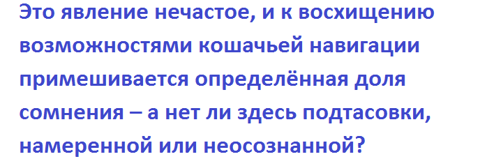 Вот именно, почему? Если бы это было обычным явлением – то есть любая потерявшаяся или выброшенная кошка всегда находила бы дорогу домой (как её находят все перелётные птицы), вопрос звучал бы по-другому: с помощью каких органов кошка добирается до дома, преодолевая значительные расстояния? Давайте разберёмся, стоит ли верить всем этим историям о чудесном возвращении усатых скитальцев. И начнём с того, как именно кошки ориентируются в пространстве. Как и большинство других животных, для этих целей кошки используют зрение, обоняние, слух и память. Роль зрения (которое по многим характеристикам превосходит человеческое) очень велика и понятна – и мы ориентируемся в пространстве с помощью зрения. Обоняние кошки также намного тоньше человеческого и позволяет уловить самые незначительные концентрации пахучего вещества. Что ещё важнее, определить МЕСТОНАХОЖДЕНИЕ источника запаха. Какую роль в поисках играет слух? Как показали исследования, кошка отлично запоминает не просто «видеоряд», н
