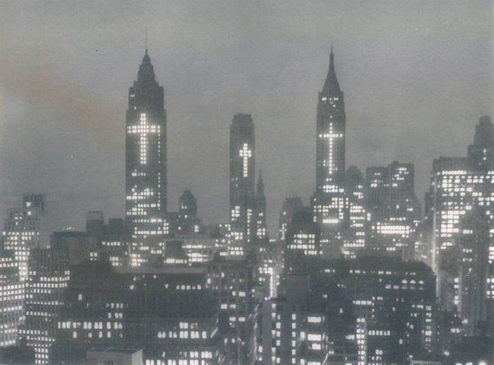 Гигантские ✝️кресты, сформированные огнями в окнах Нью Йоркских небоскрёбов в качестве украшения на Пасху в финансовом квартале Манхэттена, 1956 г.