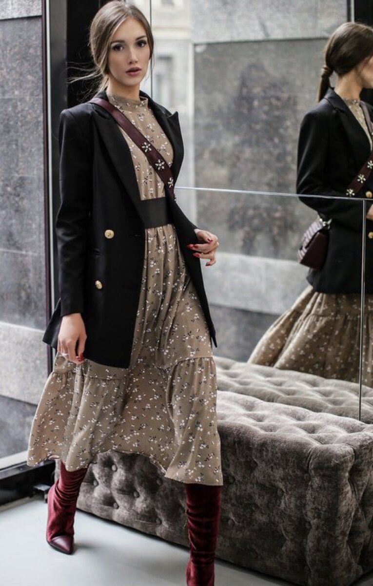 Будущей осенью Вы можете выглядеть женственно, романтично и нежно. А поможет Вам в этом цветочный принт. В отличие от весеннего сезона, осенью флористический узор приобретает более насыщенные оттенки. Цвета становятся более глубокими, сам рисунок теперь демонстрирует все богатство природы, создавая шикарный вид и изысканность. Такой вариант цветочного принта отлично сочетается со всеми оттенками коричневого и бежевого цвета. А если Вы хотите создать яркий образ, то используйте, как дополнение, более интересную палитру: Так как чаще всего вещи выполненные в цветочном принте - это платья и юбки из летящий, легкой ткани, то сочетать их необходимо с элементами гардероба более плотного материала: