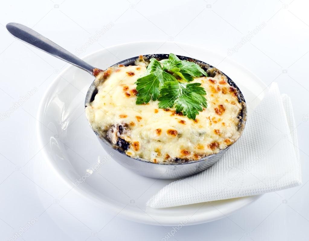 Ингредиенты : 1 кг свежих белых грибов 150 гр. сливочного масла 1 луковица среднего размера 1 стакан сметаны 15-20% 4-5 ст. ложек панировочных сухарей 5-6 сырых яиц 150 гр. твердого сыра Способ приготовления : Белые грибы изрубить, посолить, поперчить, потушить на сливочном масле. Мелко изрубленную луковицу смешать с грибами и тушить до готовности, добавить стакан сметаны, дать вскипеть. После чего добавить панировочные сухари, вбить туда яйца, перемешать и выложить в форму, смазанную растительным маслом. Посыпать тёртым сыром и запечь в духовке до готовности. Украсить зеленью. Получается очень нежная и вкусная запеканка. Приятного аппетита!