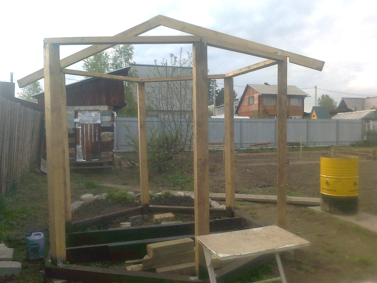 Строительство беседки состоит из нескольких видов работ, которые будут раздельно описаны мной. Потребность в инструменте: - металлический угольник 300 мм.; - рулетка L=5000 мм.; - строительный уровень L=500 мм., 800 мм.; - дисковая пила по дереву; - шлифмашинка; - дрель аккумуляторная; - молоток; - кисть для окраски; - стамеска; - топор. Применяемый пиломатериал: - Брус 100х100 мм.; -Брус 50х100 мм.; -Доска 40х180 мм.; -Доска 25х120 мм.; - Саморез по дереву 3.5х50 мм., 3.5х76 мм., 4х90 мм.; - Строительные гвозди 4х100 мм. - Крепежные элементы (уголки, пластины); - Разметочная нить. Первым делом выбираем материал, из которого будет возводиться беседка. Из-за отсутствия сварочного аппарата и опыта сварочных работ, наиболее оптимальным вариантом для строительства выбран – пиломатериал. Следующим этапом определяем на участке место наиболее подходящее для зоны отдыха. С помощью колышков из арматуры диам.10 А500С производим разбивку осей, выносим углы (так как у нас 6-ти угольная беседка, п