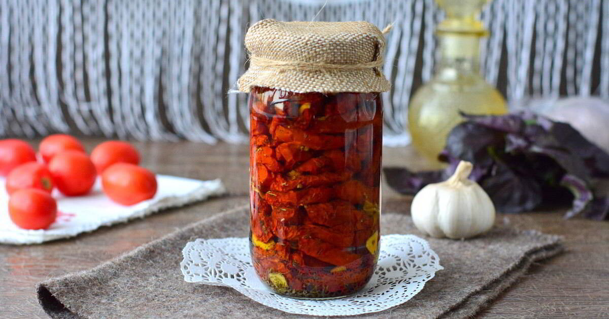 Для приготовления хорошо подходят не водянистые, плотные и не большие сорта. Лучше всего подойдут такие сорта как Черри или Сливка. Вам понадобится: Способ приготовления: 1. Томаты тщательно вымыть, протереть и разрезать на четвертинки. 2. Застелите противень фольгой или пергаментной бумагой и разложите дольки томатов разрезом вверх. 3. Приготовьте пряную смесь из соли, сахара, перца прованских трав, розмарина и измельченного чеснока. 4. Полученной смесью покройте каждую дольку и немного увлажните томаты растительным маслом. 5. Для процесса вяления помидор нужно подобрать соответствующий режим. Первые 30 минут помидоры вялятся при более высокой температуре (210-230 градусов), а на остальные 1,5 часа ставится 100 — 130 градусов. Если в вашей духовке не предусмотрен режим "Конвенция", то нужно нужно немного приоткрыть дверку духовки для циркуляции воздуха. (можно положить деревянную палочку под дверцу духовки) 6. На дно стеклянной банки плотно положить вяленые томаты а