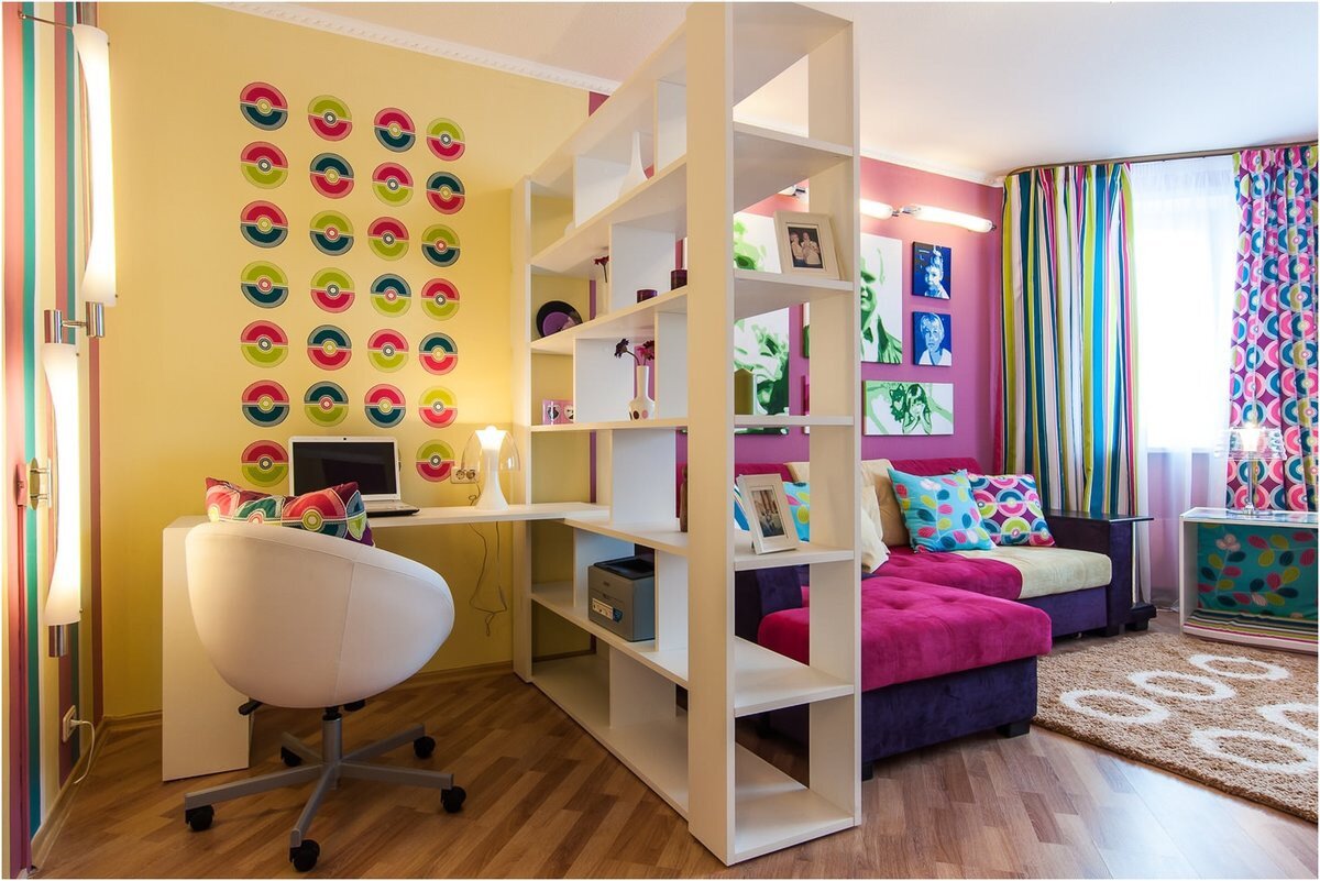Каждый ребёнок уже с малых лет представляет собой отдельную, постепенно формирующуюся личность со своими привычками и характером. Детская комната вполне может стать для малыша тем местом, где он будет чувствовать себя уютно и комфортно, если подойти к её обустройству грамотно. Зонирование комнаты на детскую и гостиную представляет собой разделение интерьера на отдельные части, выполняющие свою определённую функцию. Большую часть времени дети проводят за играми, учёбой, сном и занятиями спортом. Важно правильно оборудовать каждую из этих зон так, чтобы ребёнку было максимально удобно и приятно в ней находиться. Зонирование комнаты на детскую и гостиную Лучшим освещением в этой части комнаты будет мягкий, рассеянный свет. Ночники или настольные лампы идеально создадут уютную и располагающую атмосферу. Для расслабления и успокоения лучше всего подойдёт зелёная или голубая подсветка. Мебель, постельное белье и стены можно также выдержать в такой гамме. · Зона для сна и отдыха При э