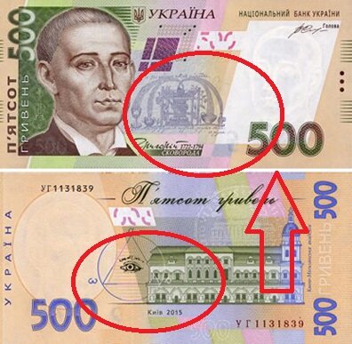 Над любой национальной банкнотой трудится целая команда специалистов, художников, идеологов, экономистов, которые в итоге создают цельную купюру, которой будут пользоваться поколения людей. Не зря каждая банкнота входит в историю, позже становится раритетом и пользуется популярностью у коллекционеров. Однако, каждая купюра Украины уникальна еще одной особенностью - на них были написаны судьбы всего народа, а точнее, желание заставить стать рабами. Заметить эти символы на протяжении многих лет никому не удавалось, да и в голову никому прийти не могло, что невинная купюра 500 гривен имеет в себе скрытые масонские знаки. Все наиважнейшие детали однажды спрятали на этих купюрах в очень мелком виде, в свою очередь, без специального снаряжение их не разглядеть. Так что же таинственного на них изображено? Вернемся к купюре 500 гривен. Пирамида со всевидящим оком- символ мирового сообщества масонов, такая же изображена на долларе. Как объясняет Нац. Банк, символ был подобран совершенно случ