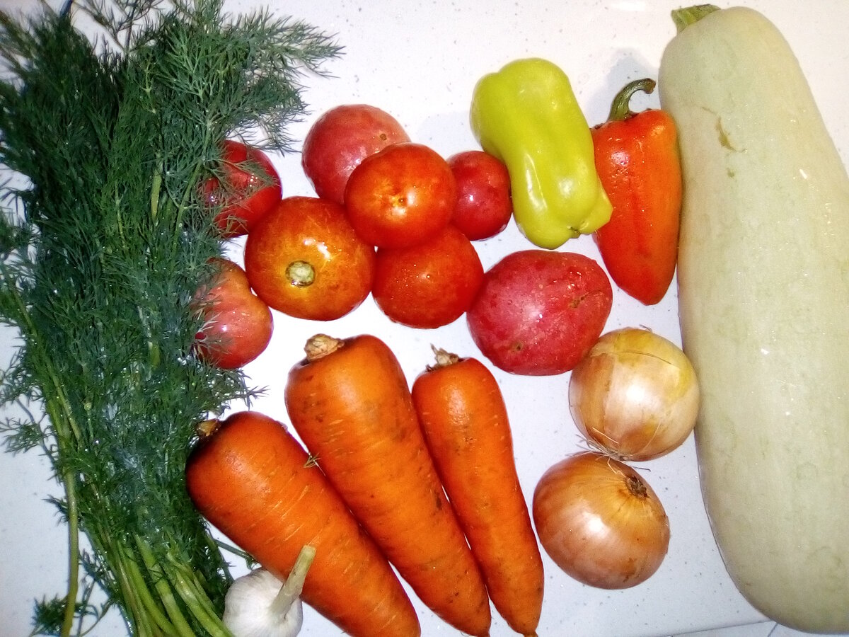 Кабачковую икру по этому рецепту лучше всего готовить летом. Именно летом низкие цены на кабачки, да и на другие овощи, которые нужны для этого блюда. Строго говоря, икру правильнее называть не кабачковой, а овощной икрой. Но я считаю, что это не так важно, тем более что без кабачка ничего не получится. Способ этот не самый быстрый, я трачу на приготовление икры из кабачков не менее полутора часов. Однако рецепт того стоит. Ингредиенты: Кабачок – один огромный или несколько маленьких Луковицы – 2 шт. Морковь – 3 шт. Болгарский перец – 4 шт. Помидоры – 850 гр. Чеснок – 1 головка Укроп – 1 пучок Растительное масло для жарки – 100 гр. Соль – 2 ч. ложки. Все овощи на фото не поместились, помидоров и болгарского перца понадобилось больше. Приступим! Первым делом занимаюсь кабачком. Кабачок разрезаю и смотрю, какие в нём семена. В больших кабачках обычно семена большие, созревшие, жёсткие. Их нужно удалить, чтобы не испортить вкус икры. В маленьких кабачках семена зелёные и мягкие, их можн