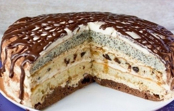 1 Смешать все ингредиенты для коржа, испечь четыре штуки, добавить в один фундук, во второй – мак, в третий – чуть распаренный чернослив, в четвертый – какао. Для прослаивания приготовить два крема один масляно-кофейный, а для другого взбить сметану хорошего качества с сахарной пудрой.