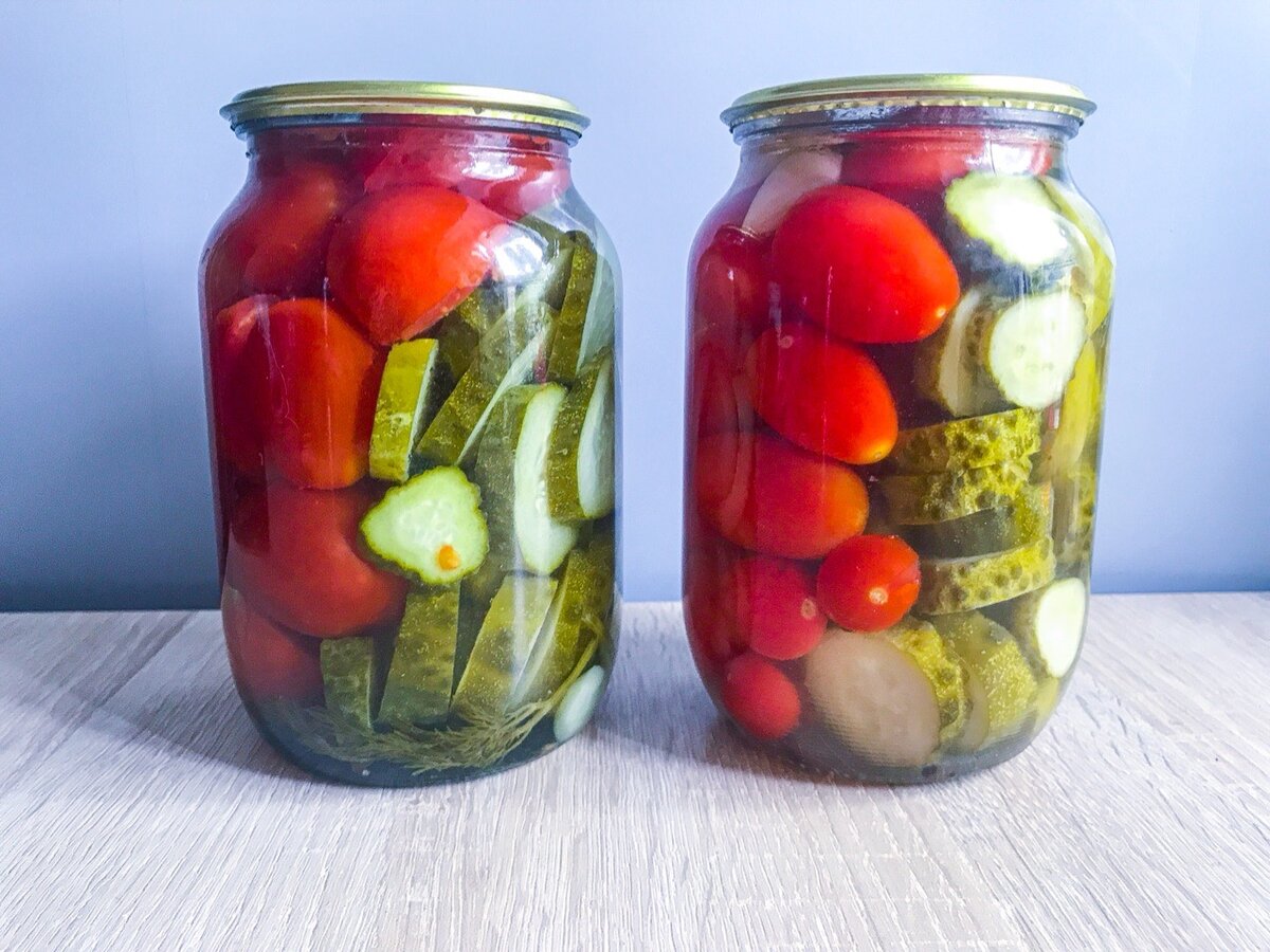 Сегодня хочу поделиться рецептом вкусной, необычной и очень красивой закуской ассорти из помидоров и огурцов. Ингредиенты из расчета на 2 банки объемом 1,5 литра: 1. Огурцы - 500-600 гр. 2. Помидоры - 500-600 гр. 3. Черный перец горошком - 6 шт. в каждую банку. 4. Чеснок - 2-3 зубчика в каждую банку. 5. Укроп - 1 веточка в каждую банку. 6. Растительное масло - 1 ст. ложка в каждую банку. 7. Уксус 9% - 1 ч. ложка в каждую банку. Маринад из расчета на 1 литр: 1. Соль - 1 ст. ложка. 2. Сахар - 1 ст. ложка. Такое ассорти из огурцов и помидоров смотрится очень эффектно. Так же это очень вкусно. А сама закрутка хорошо хранится при комнатной температуре. Всем хорошего настроения и удачных заготовок!