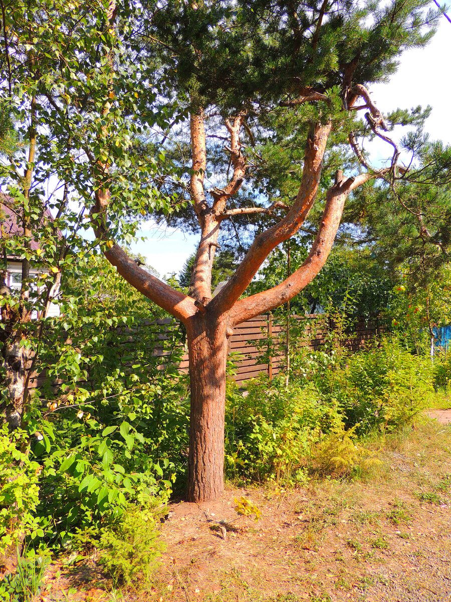 Эта удивительно красивая, видовая сосна находится в садоводстве "Петрокрепость" садового массива "ВОСХОД" на 10 линии. Кто идёт с автобусной остановки или на неё, обязательно её встретит. В своё время у неё был отрезан центральный проводник. Намеренно это было сделано или случайно, никто не знает. Теперь на ней играют детишки, так как ствол весь отшлифован. Ну, во всяком случае то, что по ней много лазают, это видно. Всё - таки я склоняюсь, что владелец фасадной зоны своего дачного участка её так сформировал. И это не случайность! Так как ниже, на фото, видно ещё одну сосну, которая сформирована в том же стиле. Только не надо сейчас бежать и обламывать макушки своих хвойных шедевров! Посоветуйтесь хотя бы с нами, как это сделать правильно, в сообществе "ХВОЙНЫЕ В ДИЗАЙНЕ САДА". С вами был Антон Корнеев. Подписывайтесь. Впереди много любопытного и познавательного материала.