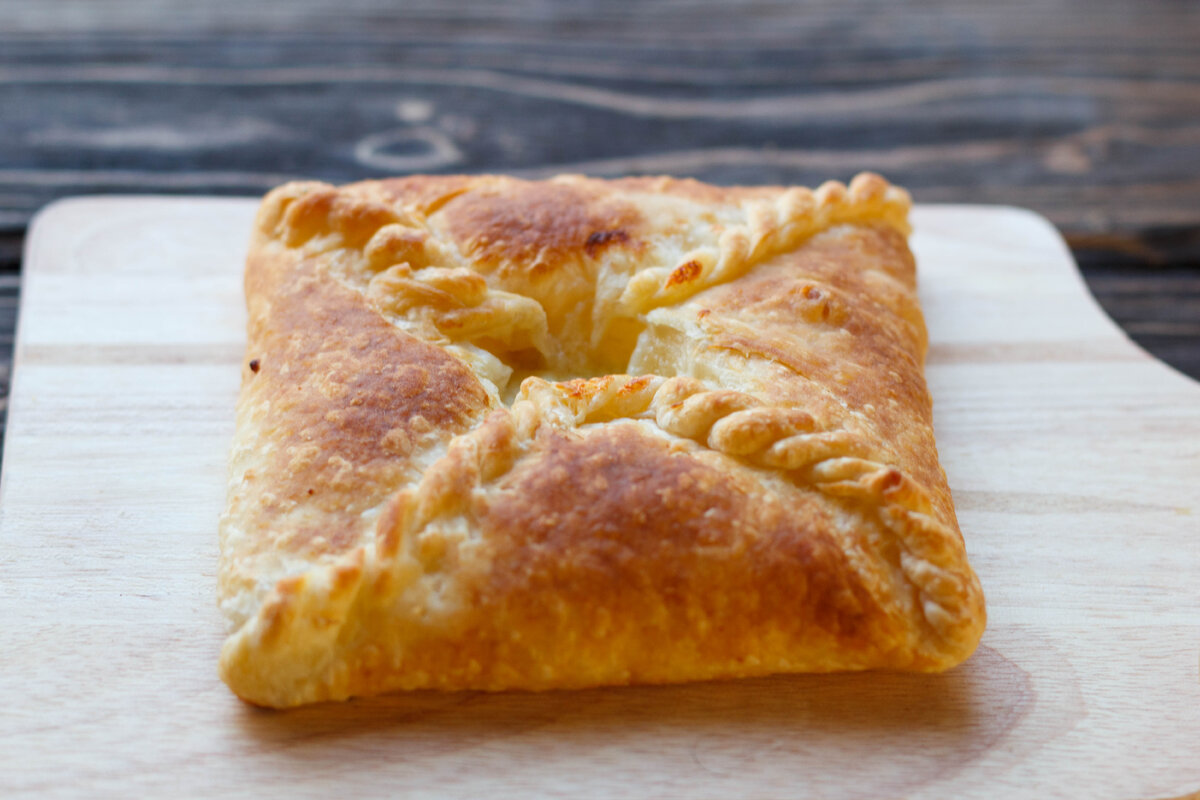 Аппетитные хачапури из хрустящего слоеного теста с нежной начинкой из знаменитого сыра сулугуни сможет приготовить любая хозяйка. Тем более, что для приготовления хачапури вам понадобится не более 30 минут. Продукты (на 8 порций) Сыр сулугуни - 300 г Тесто слоеное бездрожжевое - 500 г Яйца куриные - 2 шт. Масло растительное - 2 ст. л. Мука пшеничная - 2-3 ст. л. Соль (по желанию) - по вкусу Готовим начинку: сыр сулугуни натрите на крупной терке, добавьте одно куриное яйцо и тщательно перемешайте. При желании добавьте соль по вкусу. Стол присыпьте мукой, половину слоеного бездрожжевого теста раскатайте скалкой в форме квадрата толщиной 3-4 мм. Разрежьте пласт теста на 4 одинаковых квадрата меньшего размера. В каждую заготовку из теста положите по 1,5 ст. л. начинки. Cлепите края квадрата из теста от угла к центру, в виде конверта. Аккуратно выровняйте поверхность хачапури ладонью, чтобы вышел воздух и залепите плотно края. Противень смажьте растительным маслом. Хачапури из слоёног
